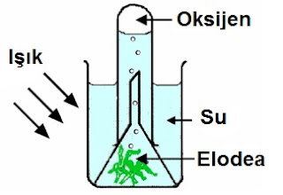 2. Oksijen oluşmasıElodea su bitkisidir. Elodea bitkisinin üzerine deney tüpü geçiriliyor. Su dolu kaba yerleştiriliyor.