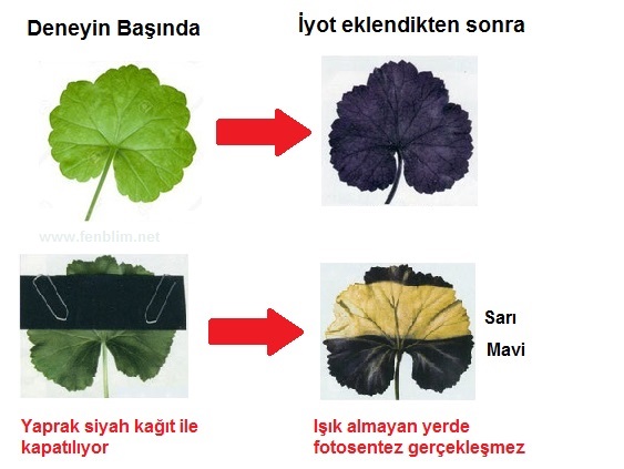 İyot çözeltisinin mavi-mor renk alması yaprağın fotosentez yaparak glikoz ürettiğini gösterir.