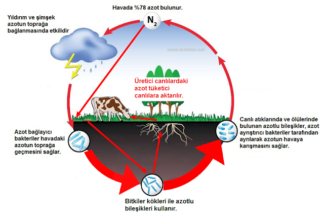 Canlı atıkları ve canlılar öldüklerinde azot ayrıştırıcı bakteriler toprağı azot bakımından zenginleştirir. Azotlu bileşiklerin bir kısmı ayrıştırılarak, havaya azot şeklinde geri döner.