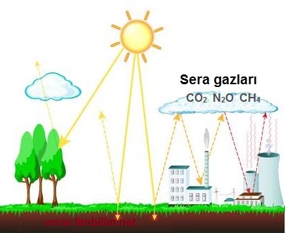 Sanayileşme ve fosil yakıtların çok kullanılmasından dolayı havadaki karbondioksit miktarı artmaktadır. Atmosferde bulunan karbondioksit, yeryüzünden yansıyan ışınları tutarak ışınların atmosfer dışına çıkmasını engeller ve dünyanın ısınması sonucu sera etkisi oluşur. Sera etkisini penceresi kapalı güneş alan bir otomobil içerisinde görebiliriz, otomobil içerisine giren güneş ışığı dışarı çıkamadığı için içerisi çok sıcak olur.