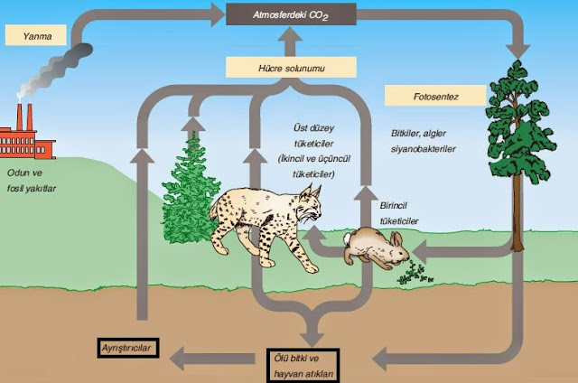 Canlıların ölmesi sonucu yapılarında bulunan karbonlu bileşikler, ayrıştırıcı canlılar tarafından tüketilerek karbondioksite dönüştürülür.